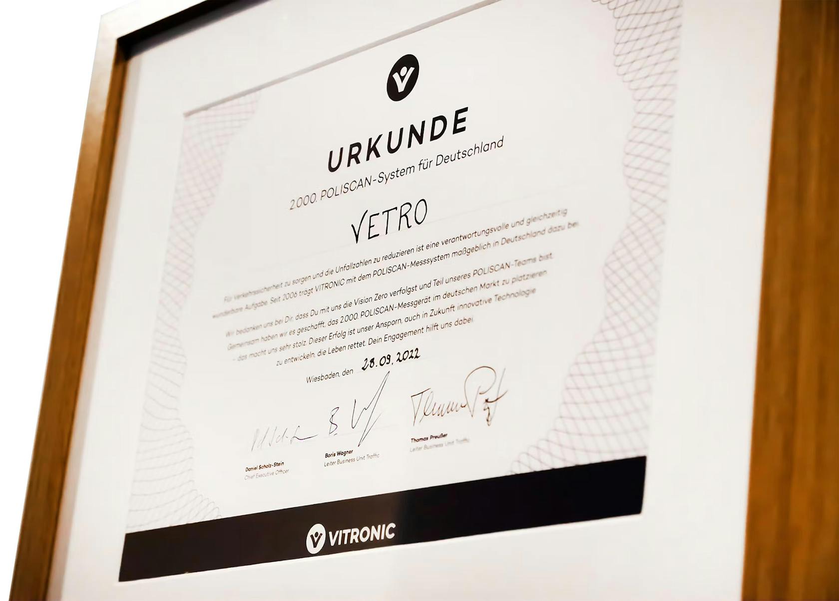 Anlässlich des Besuches von Matthias Pörner am 21. / 22. Oktober wurde uns im Namen von VITRONIC eine Urkunde als Dank für unser unermüdliches Engagement im Sinne der Verkehrssicherheit überreicht.